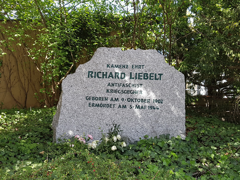 Im Anschluss daran erfolgte ebenfalls ein kurzes Gedenken an der Grab- und Erinnerungsstätte für die Gefallenen im 2. Weltkrieg auf dem St. Just-Friedhof. Des Weiteren ehrte der Oberbürgermeister mit einem Blumengebinde am Wicha-Gedenkstein in Bernbruch den Kamenzer Stephan Wicha, der mit seinem Einsatz mit dafür sorgte, dass die Stadt Kamenz 1945 kampflos übergeben wurde.