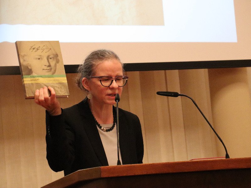 Zum Abschluss der Veranstaltung stellte Dr. Sylke Kaufmann (Foto 3) den von Wolfgang Albrecht 2018 veröffentlichte Ergänzungsband „Lessing in persönlichen Kontakten und im Spiegel zeitgenössischer Briefe" vor. Diese für die Lessing-Forschung wichtige Materialsammlung wurde vom Lessing-Museum herausgegeben.