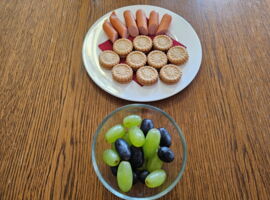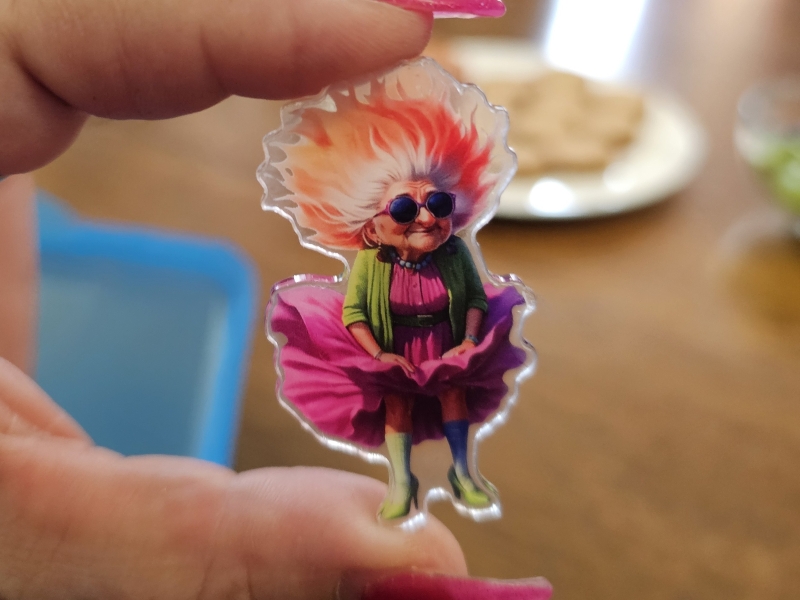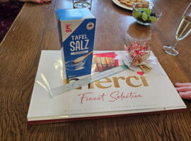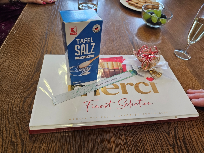 „Die geilen E's" waren zum ersten Antrittsbesuch beim Stadtoberhaupt nicht mit leeren Händen gekommen. Wollten sie den OB bestechen oder milde stimmen? Wer weiß. Aber eine Schachtel Praline war als Nervennahrung gedacht und mit einer prallgefüllten Schachtel Salz (, die leider etwas zu spät kam), wollte man der Stadt bei der Salzbevorratung helfen. Schließlich bekam der OB noch das „Dings“ geschenkt, einen Pin, der ihn zum Ehrenmitglied dieser berühmt-berüchtigten Frauenvereinigung machte. Der OB revanchierte sich mit coolen Getränken und mit einem fulminanten Mahl, welches vegan (Weintrauben), vegetarisch (Kekse) und fleischlich (Wiener) war.
