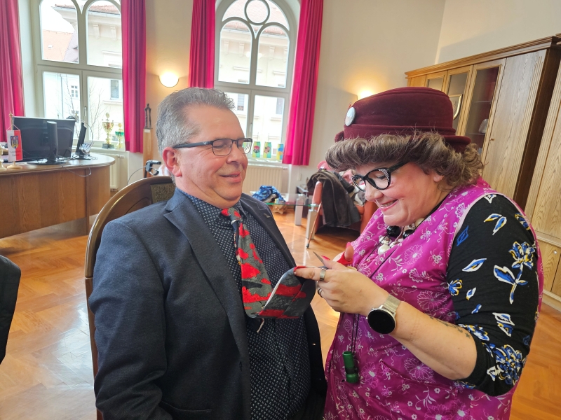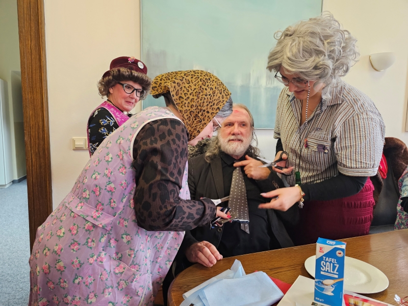 Selbstverständlich durfte das Krawattenabschneiden nicht fehlten und so gab es gleich drei „Opfer“, die aber mit ihren Schlipsen gut vorbereitet waren: Der Weiberfastnachtsneuling, OB Michael Preuß, der Weiberfastnachtsveteran, sein unvergleichlicher (So viel Eitelkeit muss sein …) Referent, sowie der männliche Weiberfastnachtsunterstützer, Jens Krüger. Sie alle mussten zwar nicht Federn lassen, aber die Krawatten können wohl nicht mehr zu offiziellen Anlässen getragen werden.