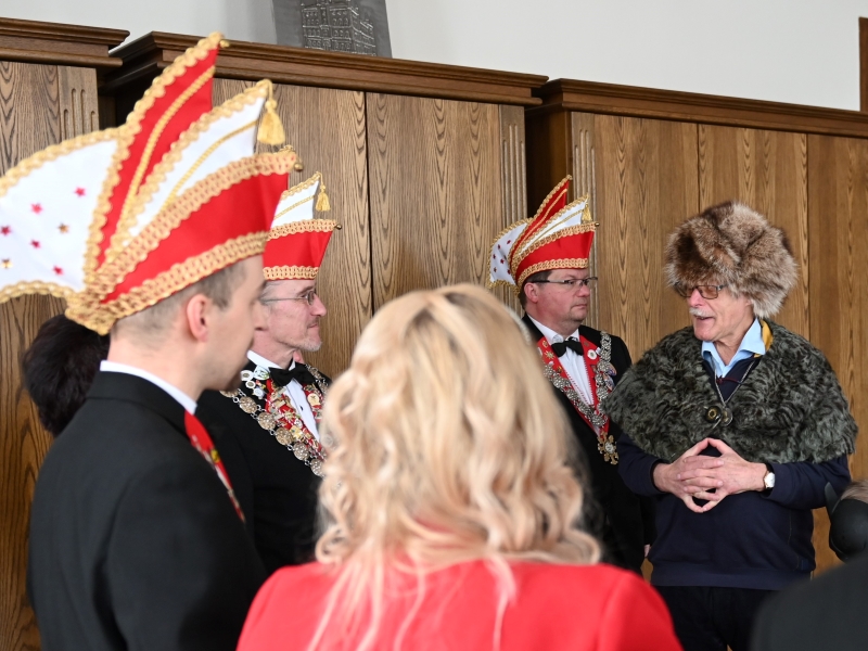 Rosenmontag 2026 in Kamenz: Es schneit! Doch dies hält die pflichtbewussten Kamenzer Karnevalisten nicht davon ab, pünktlich 11 Uhr zum Termin im Rathaus zu erscheinen und die Amtsgeschäfte wieder in die Hände der Verwaltung zu legen. Ein unerwartet harter Winter begleitete die Amtszeit des KKC e.V. und so waren die Hoffnungen beim stellvertretenen Stadtoberhaupt Jörg Bäuerle, der OB Michael Preuß vertrat, nicht groß, dass die Stadtkasse gut gefüllt zurückgebracht werden würde.