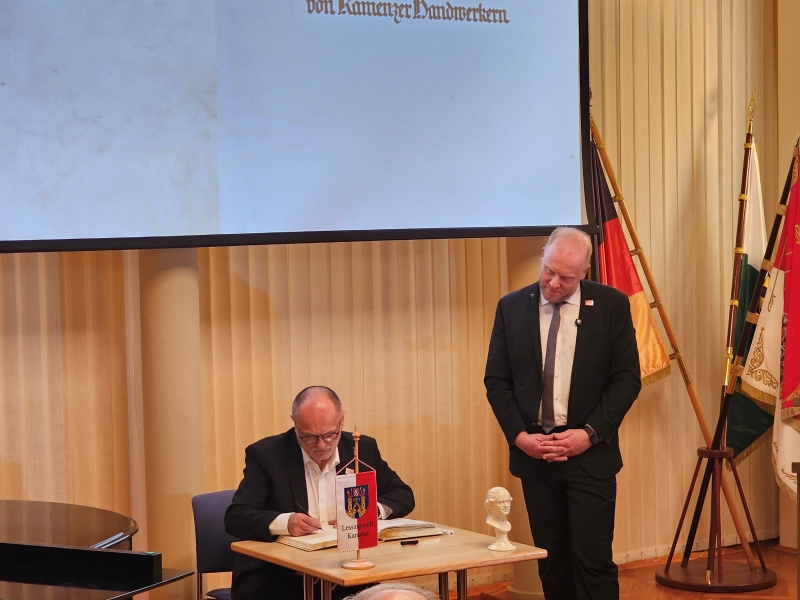 Hatte in der Vergangenheit der jetzige Oberbürgermeister a.D. immer wieder einmal mit einem Überraschungsgast zum Neujahrsempfang aufgewartet, so betraf es ihn dieses Mal selbst. Sein Amtsnachfolger hatte ihm die Ehre angetragen, sich in das „Goldene Buch der Stadt Kamenz“ einzutragen, eine Bitte, der er sehr gern nachkam. Ungewohnt mit wenigen Worten kommentiert, trug er sich in das „Goldene Buch“ mit den Worten ein: „In einer kleinen Stadt – muss man groß denken. Manchmal ist es uns geglückt – und es hat uns auch die Anerkennung von außen eingebracht. Mit Dankbarkeit, Freude u. Demut trage ich mich heute in das Goldene Buch unserer Stadt ein. Seit 37 Jahren im Dienst unserer Stadt, davon 21 als Oberbürgermeister haben mich die Heimatverbundenheit und die Arbeit der Menschen immer wieder beeindruckt. Wir haben vielen zu danken. Roland Dantz Oberbürgermeister a.D.“ Was folgte, waren Standing Ovations.