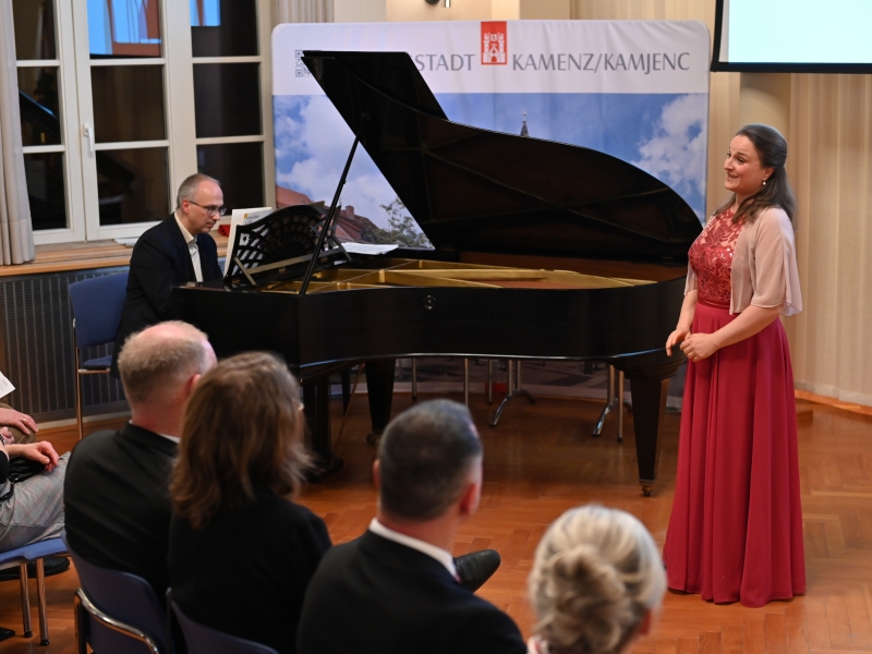 Ehe sich OB Michael Preuß mit seiner Neujahrsrede an die anwesenden Gäste wandte, sang zum ersten Mal die Koloratursopranistin Jennifer Riedel, begleitet vom Korrepetitor Andreas Kühn, ein Stück aus der Operette von Carl Zeller, dem weitere Operettenmelodien an diesem Abend folgen sollten und die vom Publikum mit viel Applaus bedacht wurden.