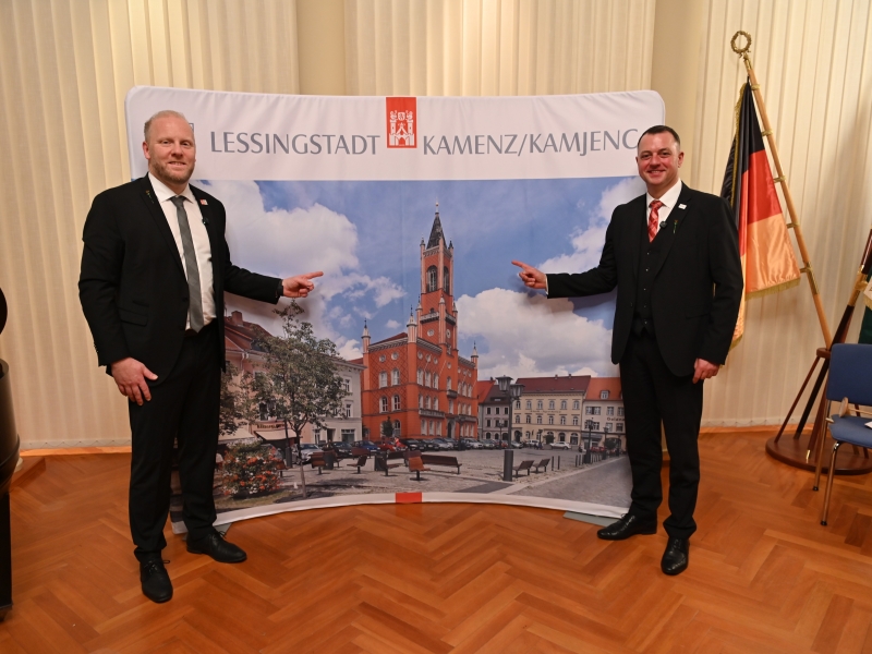 OB Michael Preuß und Landrat Udo Witschas: Um das geht es – das Rathaus als Symbol für die Stadt Kamenz.