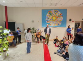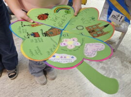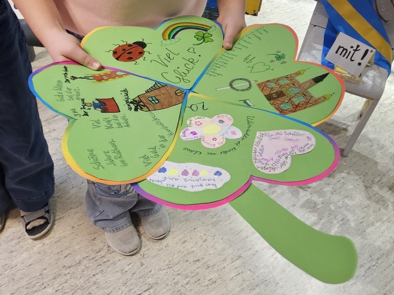 Zum Schluss schenkten ihm die Kinder ein selbst gebasteltes Glückskleeblatt mit den besten Wünschen für seine Arbeit als Oberbürgermeister, so z.B. „Gute Ideen bei der Arbeit“ oder „Schöne Jahre im Rathaus“ oder auch – und sogar sehr wichtig – „Viel Geld in der Haushaltskasse“. Das Glückkleeblatt wird jetzt im Dienstzimmer des OBs im Rathauses liegen und ihn an diesen Besuch und die damit verbundenen Wünsche erinnern.