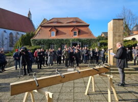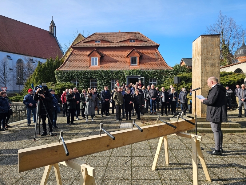 Nach viel Schnee, Regen, Eisglätte und Nebel wartet das Wetter am Mittwoch, dem 25. Februar mit bestem Sonnenschein auf. Der Anlass gab‘s auch her, denn es wurde das Richtfest im Rahmen der Sanierung und des Umbaus des Lessing-Museums gefeiert. Dazu hatten sich zahlreiche geladene Gäste und Besucherinnen und Besucher am Lessing-Museum versammelt, um der traditionellen Zeremonie des Dankes an die bauausführenden Firmen und Handwerksbetrieb beizuwohnen. Der Richtspruch der Firma F+S Mieting Bau GmbH wurde durch Werner Lindner hoch oben vom Dach des Neuanbaus des Lessing-Museums gesprochen. Darin heißt es u.a.: „So hieß es schon vor Jahren – doch fehlte oft das Geld, erst jetzt ist es gelungen – wir hoffen, daß es hält / Es [der Anbau – Anm. d. Verfassers] schmiegt sich an den Altbau wie Kamenz an den Berg und zeugt von guter Arbeit und fleiß’ger Händewerk / Doch bleibt es ja nur Hülle für Lessings guten Geist, der mit der Ringparabel auch uns die Richtung weist.“ (Voller Wortlaut des Richtspruches hier)