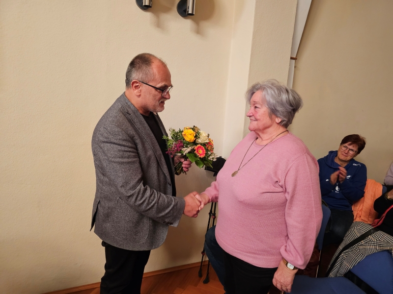 Bild 2 OB Dantz übergibt der sichtlich überraschten Ehefrau des Geehrten, Edeltraud Schnappauf, einen Blumenstrauß.