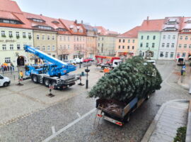 Wie jedes Jahr montags vor dem 1. Adventssonntag wurde auch dieses Jahr pünktlich der Weihnachtsbaum auf dem Kamenzer Marktplatz aufgestellt. Es gab ca. neun Angebote für eine Weihnachtsbaum. Letztendlich wurde der Baum genommen, der vom Kamenzer Kinderhaus „Langes Gässchen“ gespendet wurde. Vielen Dank! Es handelt sich um eine Colorado-Tanne, die in etwa 12 Meter hoch ist. Die Baumbeleuchtung wird am 28. November angebracht, so dass – wenn alles gut läuft – der Weihnachtsbaum auf dem Markt erstmalig an diesem Tag auch beleuchtet sein wird, spätestens aber bis zum Wochenende..