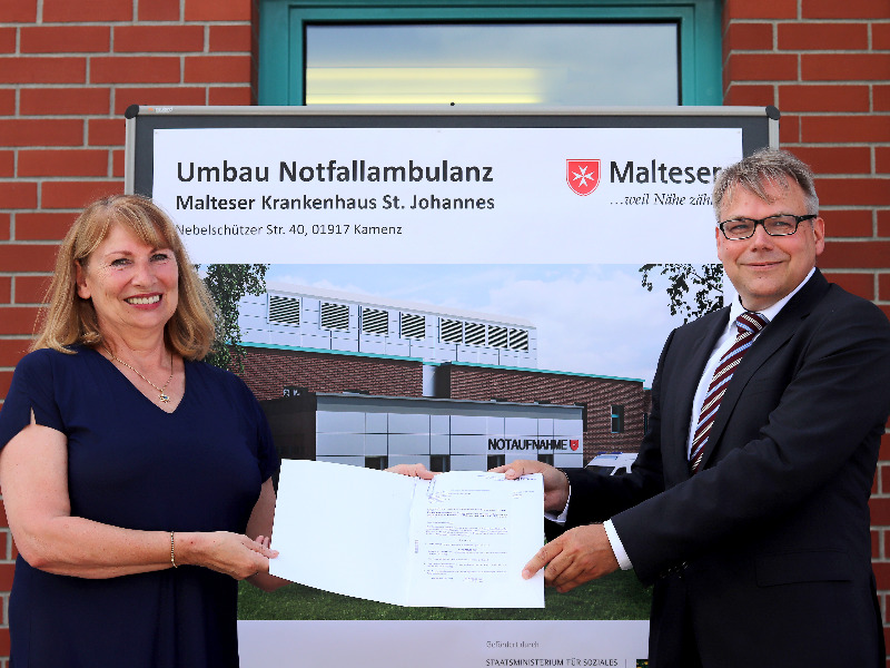 Sozialministerin Petra Köpping vom Freistaat Sachsen übergibt dem Geschäftsführer Sven Heise der Malteser Sachsen-Brandenburg gGmbH den Förderbescheid für die „Integrierte Zentrale Notaufnahme im Malteser Krankenhaus St. Johannes".