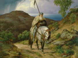 Der Referent zeigt die spannende Geschichte des Zeitalters vor 800 Jahren mit steinernen Zeugen, Personen und Ordensgemeinschaften der Kreuzfahrerzeit und führt die Zuhörer in Wort und Bild u.a. nach Altzella, Bad Kissingen, Creuzburg, Doberlug, Eisenach, Frauenroth, Freyburg an der Unstrut, Grimma, Marburg, Meißen, Oschatz, Stadtilm und Würzburg sowie nach Akkon und Jerusalem. Mit dabei sind auch Personen aus dem sächsisch-thüringisch-fränkischen Raum wie Markgraf Heinrich der Erlauchte, Elisabeth von Thüringen, Otto von der Botenlaube oder Walther von der Vogelweide. Auch aus dem Land zwischen Elbe und Elster zogen einst Ritter gen Jerusalem, vor mehr als 800 Jahren ebenso wie vor gut 500 Jahren, als sich der sächsische Kurfürst Friedrich der Weise in Jerusalem zum Ritter schlagen ließ. Jerusalem gab es damals indes nicht nur im Heiligen Land, und so konnte der geneigte Pilger von Kamenz aus bereits nach wenigen Tagesreisen Jerusalem erreichen (Foto: Heimkehrender Kreuzritter (Carl Friedrich Lessing 1808-1880).
