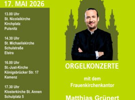 Am Sonntag, dem 17. Mai lädt Matthias Grünert, der renommierte Kantor der Frauenkirche Dresden, zu einem besonderen musikalischen Erlebnis ein: ein Orgelspaziergang durch die historischen Kirchen in Pulsnitz, Elstra und Kamenz! In mehreren Kirchen wird Matthias Grünert an der Orgel spielen und mit seiner virtuosen Interpretation ein abwechslungsreiches Konzertprogramm bieten. Jedes Stück wird einzigartig sein, sodass kein Moment sich wiederholen wird – eine ganz besondere Gelegenheit, die Vielfalt der Orgelmusik zu erleben. Der Orgelspaziergang ist eine musikalische Reise durch die unterschiedlichen Klänge und Facetten der Orgel, bei der die Zuhörer sowohl die Vielfalt der Kirchenbauten als auch die Kunstfertigkeit des Spielens genießen können. Die Auswahl der Werke reicht von barocken Werken bis hin zu zeitgenössischen Kompositionen, sodass für jeden Musikliebhaber etwas dabei ist.
